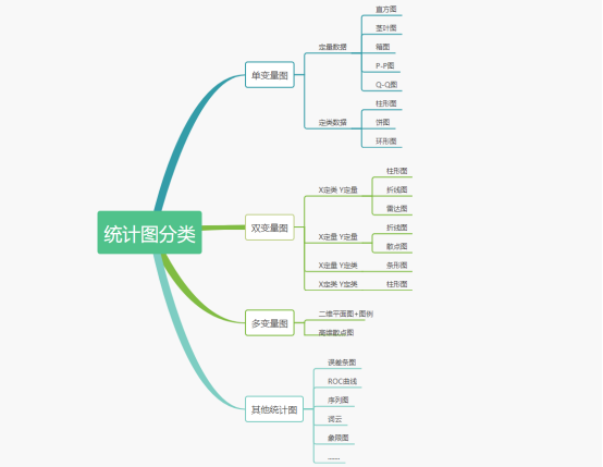 统计图大致可分为:单变量图、双变量图、多变量图等,每个类别下按照数据的数据类型还可以再进行细分,具体分类如下: