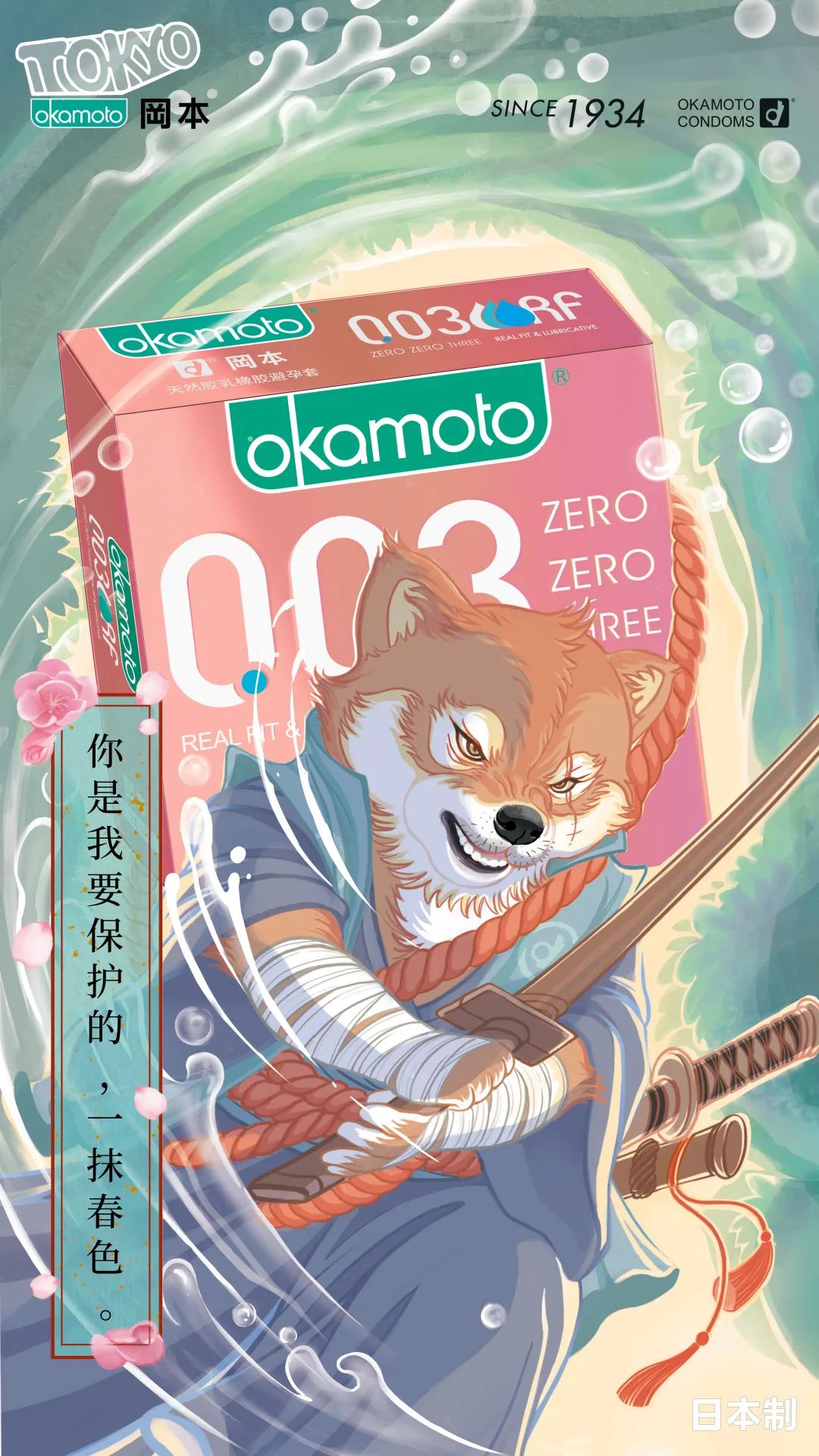 同时,各场景匹配一句唯美文案,亦成为文案的完美注解,赠予受众关于爱的遐想空间。你看秋田犬,性格忠贞不二,在日本文化中象征守护者。海报里,它身着武士服,手持武士刀,配以文案:“你是我要保护的,一抹春色。”让人很快明白,它是品牌的外化表达。品牌则欲借此说明,岡本是亲密关系的守护者,守护爱情,更守护人们对爱的向往和追求。