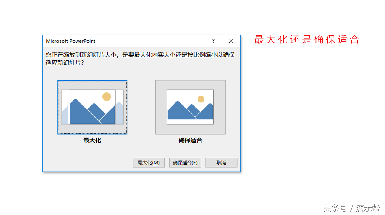 设置好了后,我们单击确定即可,但这时往往又会遇到一个新问题:PPT要求我们选择修改后的PPT大小是“最大化”,还是“确保适合”。对于这个问题,如果我们是刚刚新建的PPT,那么确保适合就不用考虑了,因为这时根本不存在内容,不需要去考虑内容适合的问题。