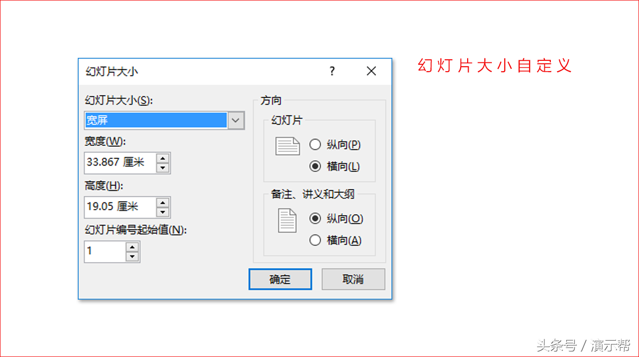 在弹出的“幻灯片大小”对话框中,列举了一些常用的幻灯片比例,还可以在宽度上和高度上进行自定义。这里的宽度和高度应当和我们使用的显示器大小一致,在设置时,也需要考虑宽度和高度的比例与显示器的比例一致,如此,我们就能保证PPT在放映时以全屏展示。