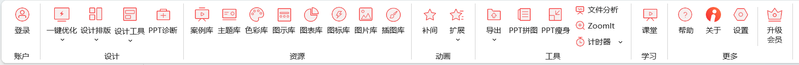 iSlide插件的功能面板简洁明了,包括了设计,资源,动画,工具和学习等各种功能,能够满足图形,色彩,页面布局等一系列的需要.