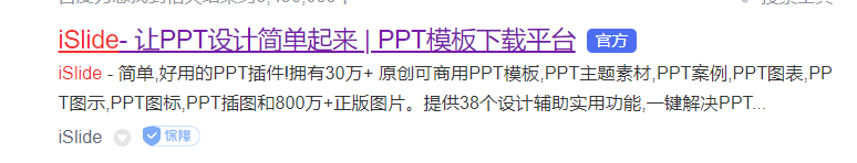 直接在搜索框搜索"iSlide",就会找到iSlide插件的下载官网,如下图这样,千万不要点到第三方网址,毕竟某度经常把广告推广优先展示.