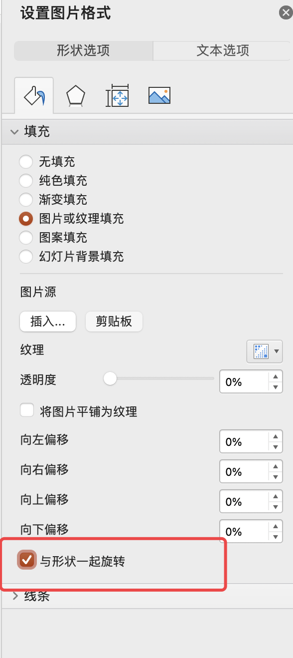 在设置中有个选项“与形状一起旋转”,