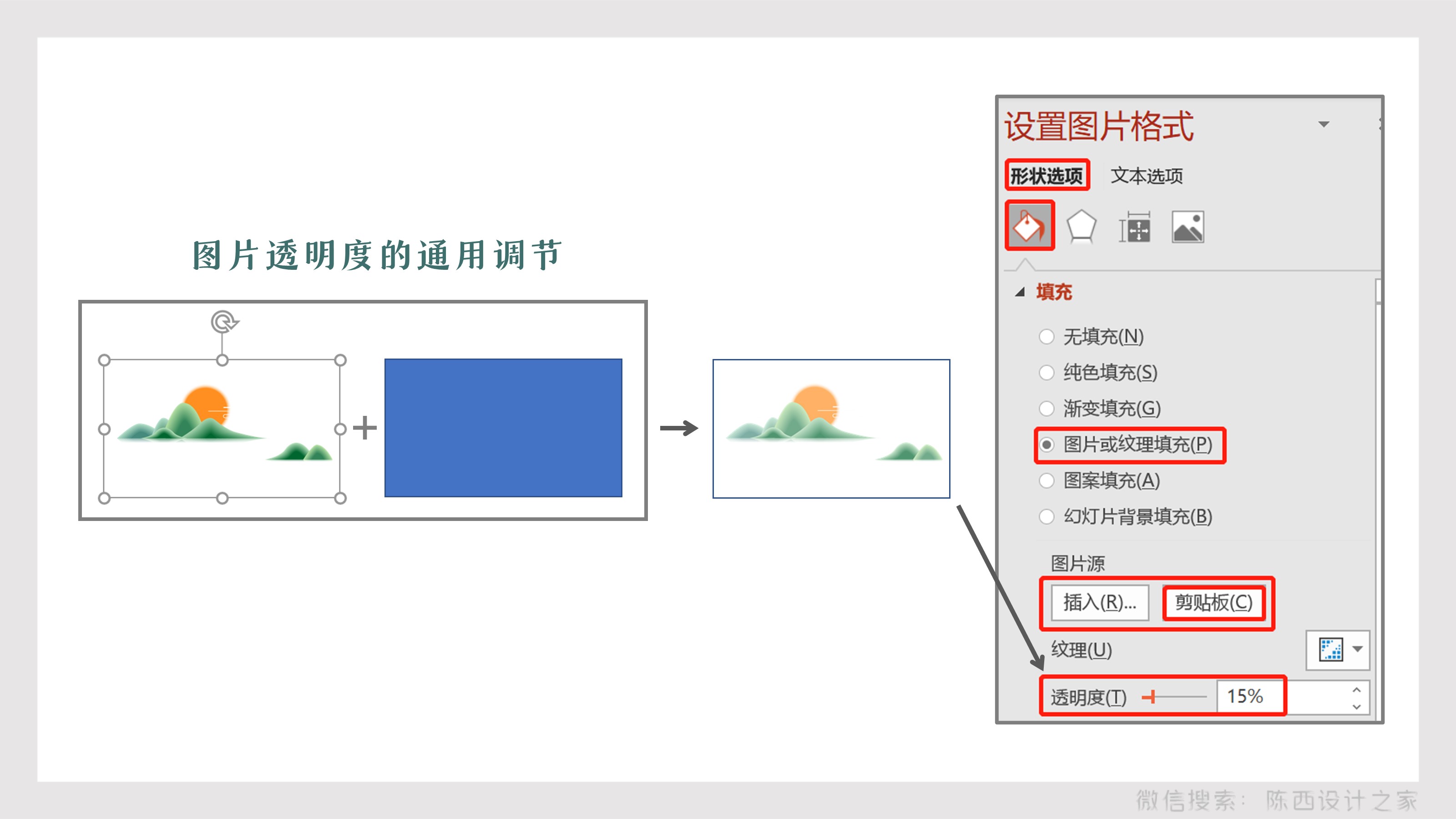 目前比较通用的方法是,图片填充到形状里面调节透明度可以保持效果。如下: