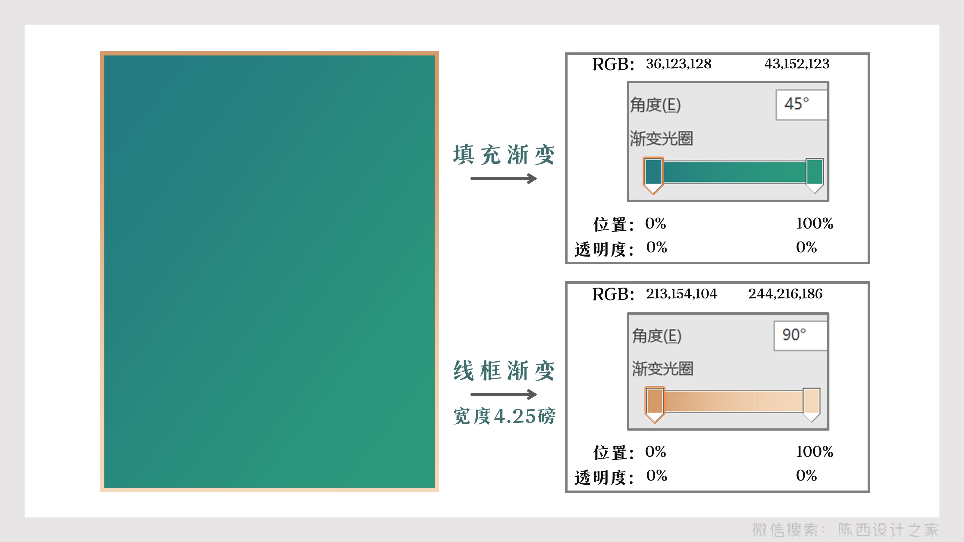 都是线性渐变,一个设置的是45度浅绿色渐变,另一个设置的是浅米黄色90度渐变。参数可以参考上图。