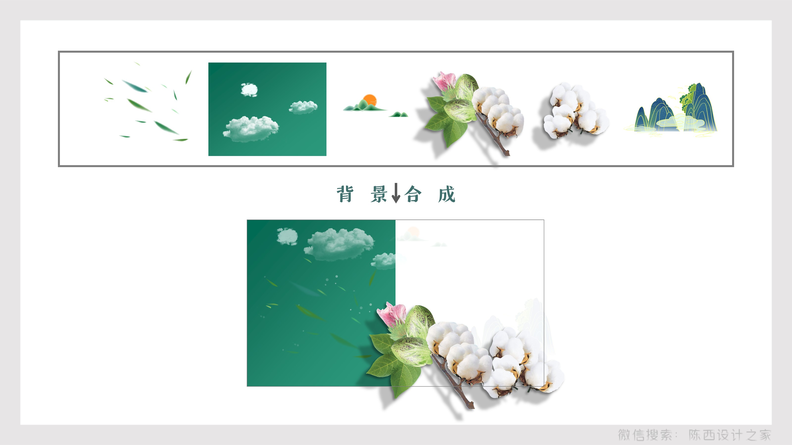 然后是整体背景的美化装饰设计。装饰元素我们选用的大部分都是和联想到棉花的意向词有关的元素。