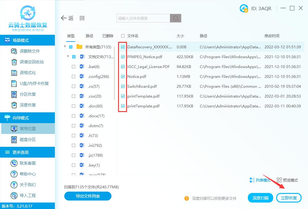 首先到官网免费下载安装云骑士数据恢复软件(软件不能安装在丢失盘中),打开软件操作界面以后,根据需要选择恢复模式进行扫描恢复,恢复过程中保护数据安全,所以不用担心重要的pdf文件被泄露。具体恢复步骤如下:
