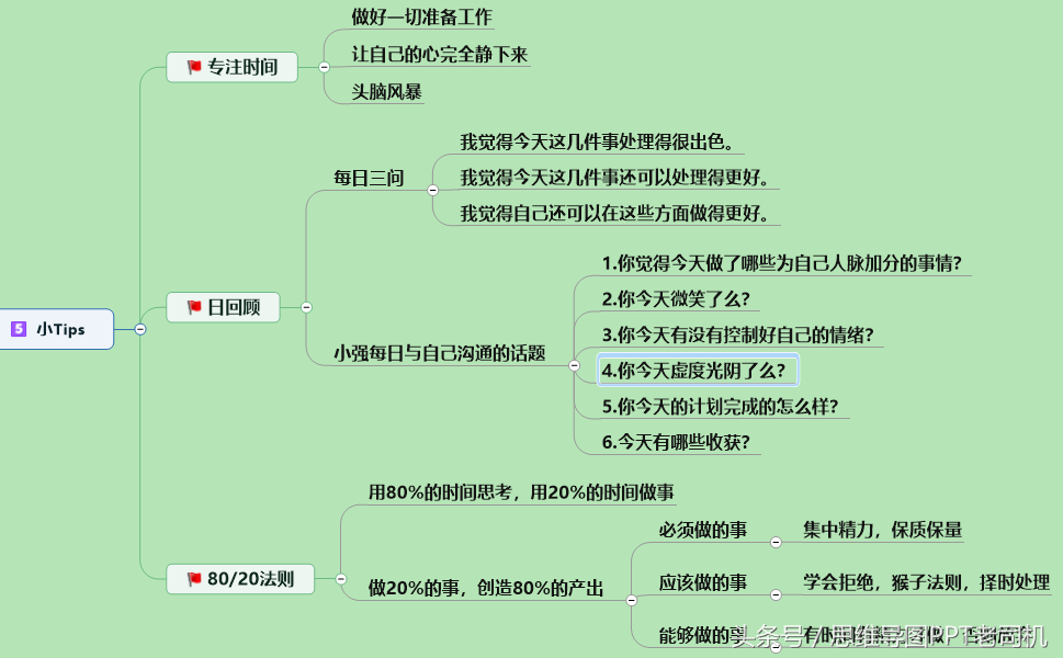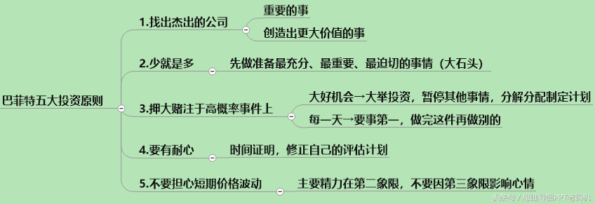 - 押大赌注于高概率事件上:大好机会→大举投资,暂停其他事情,分解分配制定计划;每一天→要事第一,做完这件再做别的