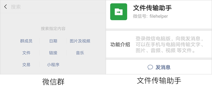 它比文件传输助手更好使,因为它保留了搜索功能,还可以按日期、文件、图片以及视频等等查询,找资料的时候更好找~