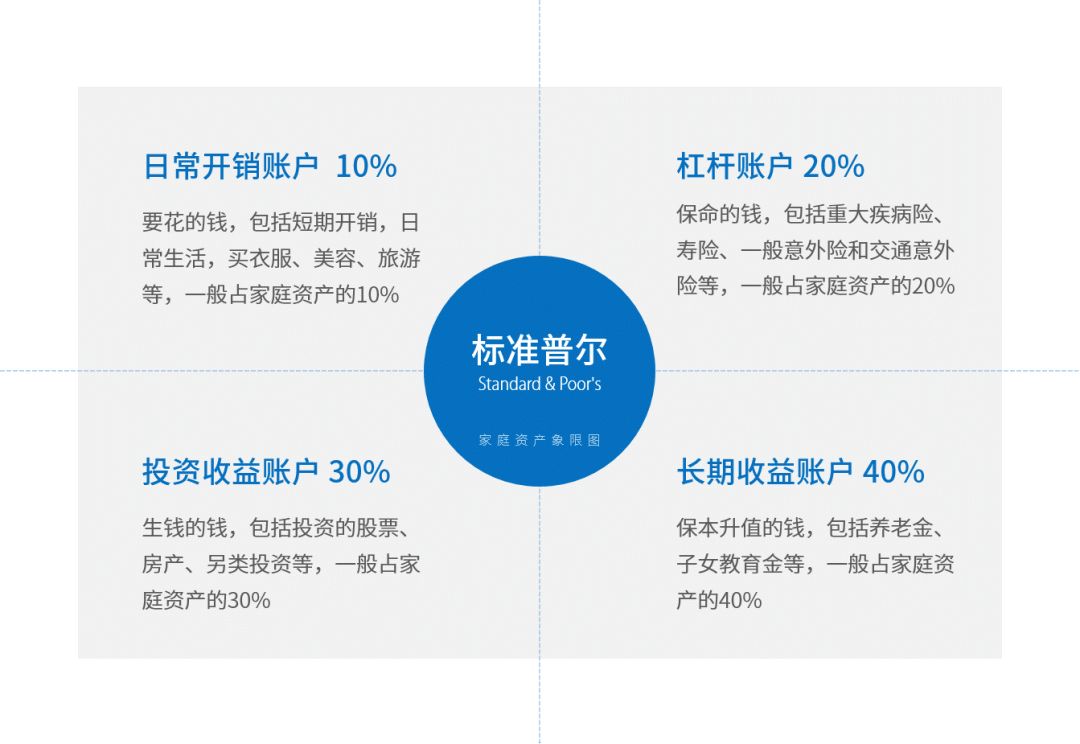 “标准普尔为全球最具影响力的信用评级机构,曾调研全球十万个资产稳健增长的家庭,分析总结出他们的家庭理财方式,从而得到标准普尔家庭资产象限图。此图被公认为最合理稳健的家庭资产分配方式。”