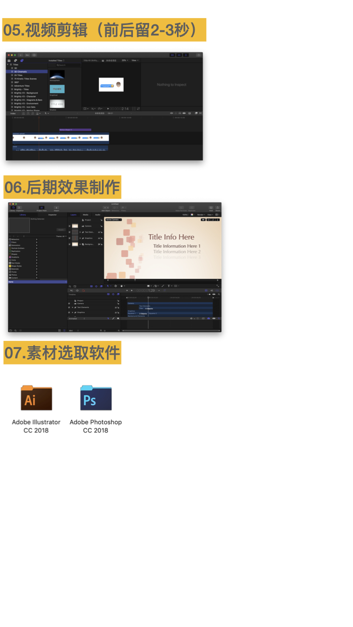 首先要掌握软件,包括Adobe公司的全家桶。Mac OS的FCPX Motion Keynote 等。