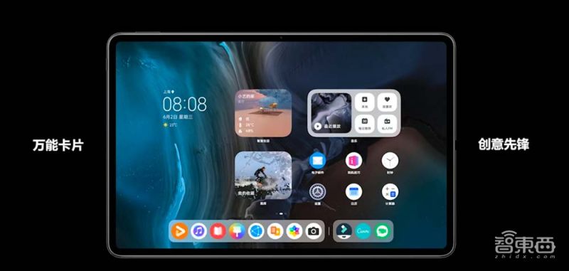 屏幕之外,鸿蒙OS当然是MatePad Pro最核心的变化,与手机上的鸿蒙OS类似,MatePad Pro的桌面上也有“万能卡片”,同时“大文件夹”里的APP可以直接点击打开,减少了跳转层级。