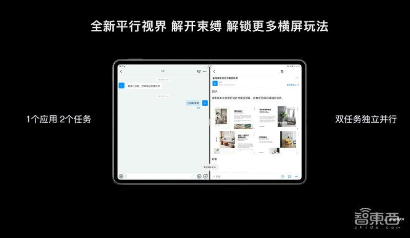 提到华为平板,平行视界功能必不会缺席,据称目前全球已有4000多款应用支持平行视界,并且此次华为增加了“解锁”功能,可以让平行视界下、同一个应用内的两个任务分别在左、右屏独立运行。