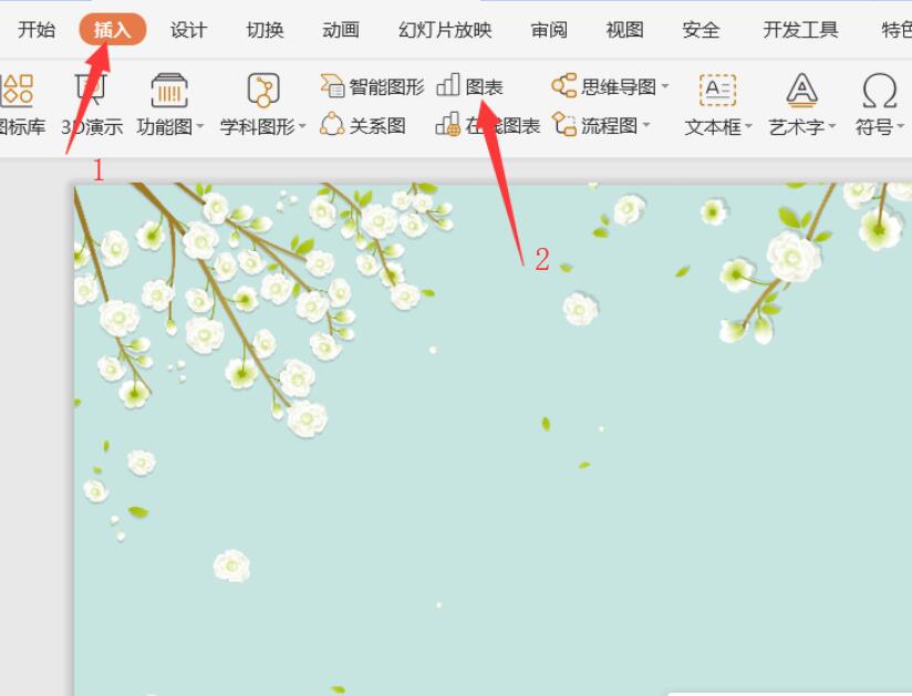 先打开PPT,然后在顶部的菜单栏中点击插入,在下方插入图表: