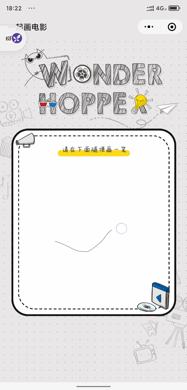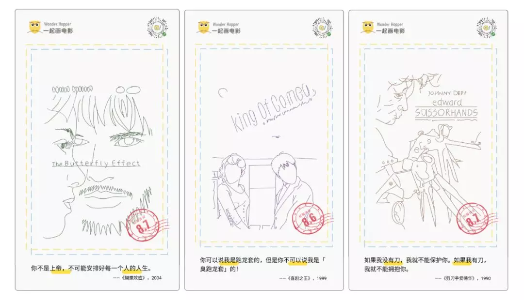 在「一起画电影」小程序中,你只用随意地画上一笔,它就能顺着你画的轨迹,创作出一幅简笔画电影报。