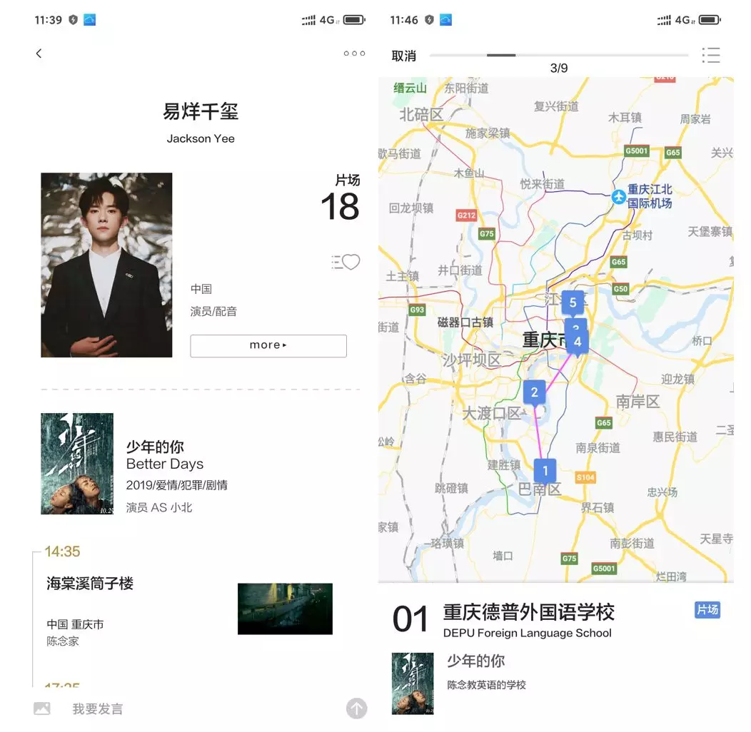 截至今年 2 月,「片场」已收录了 900+部电影电视剧,12900+个取景地,你可以通过电影、城市、演员等搜索,加入地点即可规划旅行路线,定制专属于自己的电影之旅。