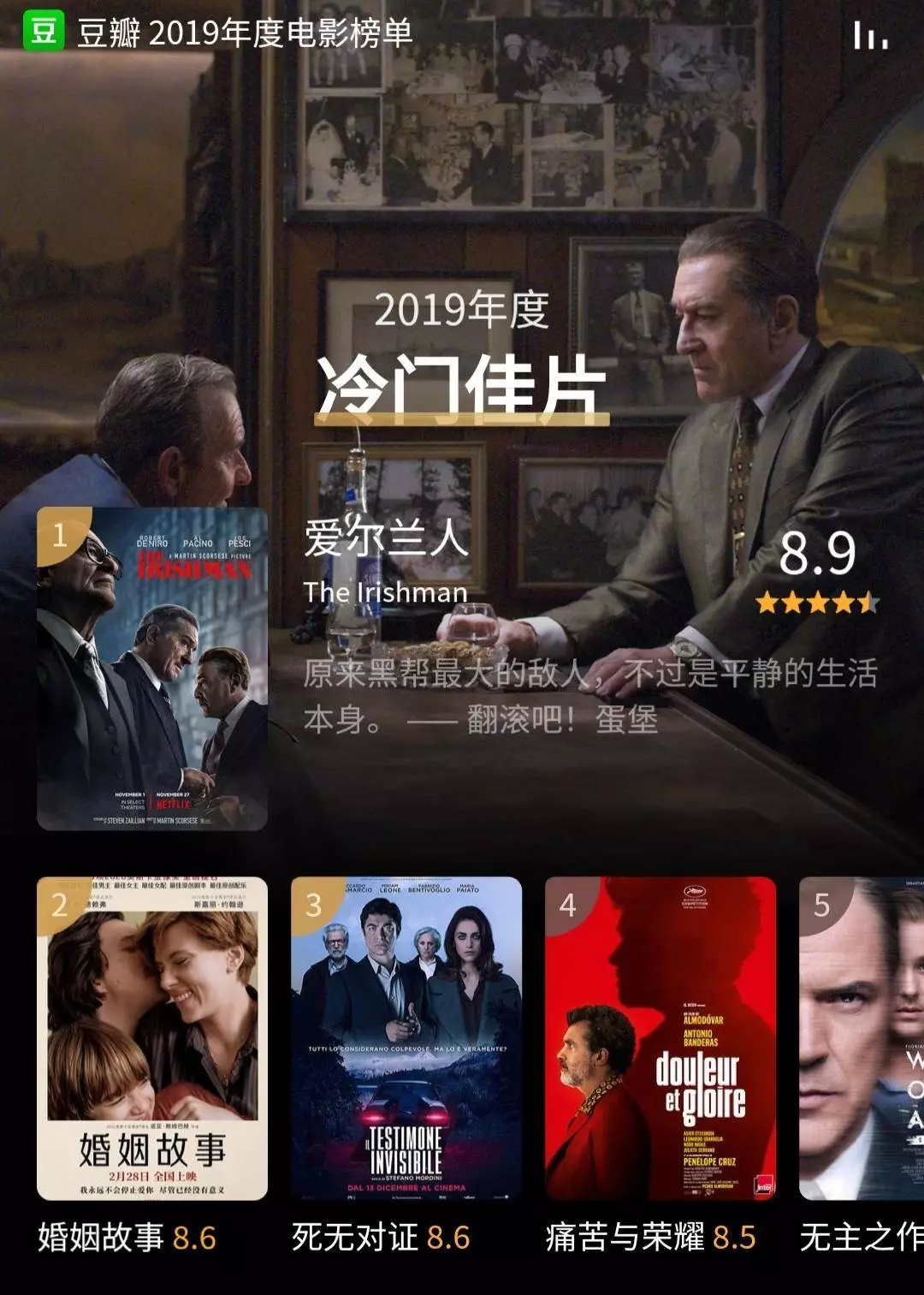 比如知名度不高,但是备受好评的《爱尔兰人》,位于 2019 年年度冷门佳片榜首,不让你错过每一部好电影~