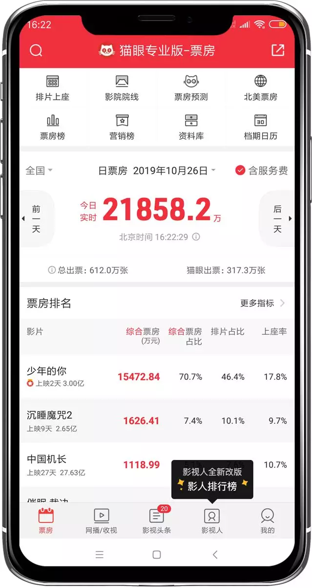其实不用等微博热搜,我们自己就可以获得实时的票房信息,「猫眼专业版」(App 和小程序均有)推荐给大家~