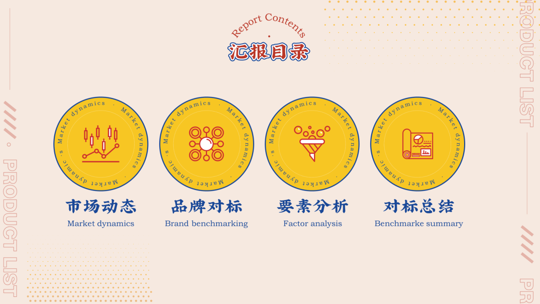 左侧的“目录”两个字,用书法字体,有中国风的气息,另外,序号用到了色块叠加,页面的层次级出来了,显得非常高级。