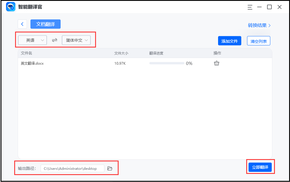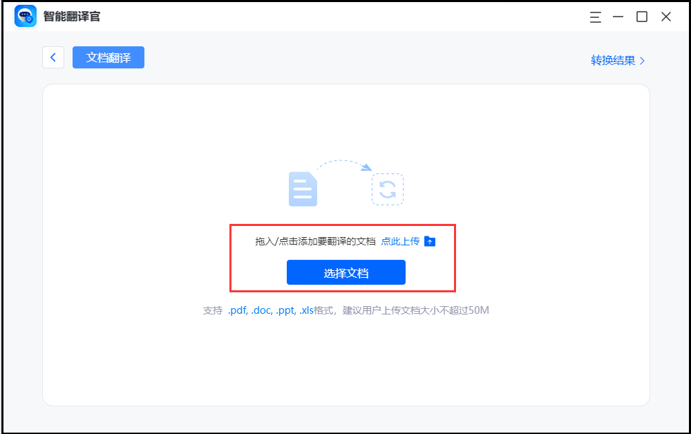 点击“选择文档”按钮,上传要翻译的文档,软件支持doc、pdf、ppt、xls文档格式上传;