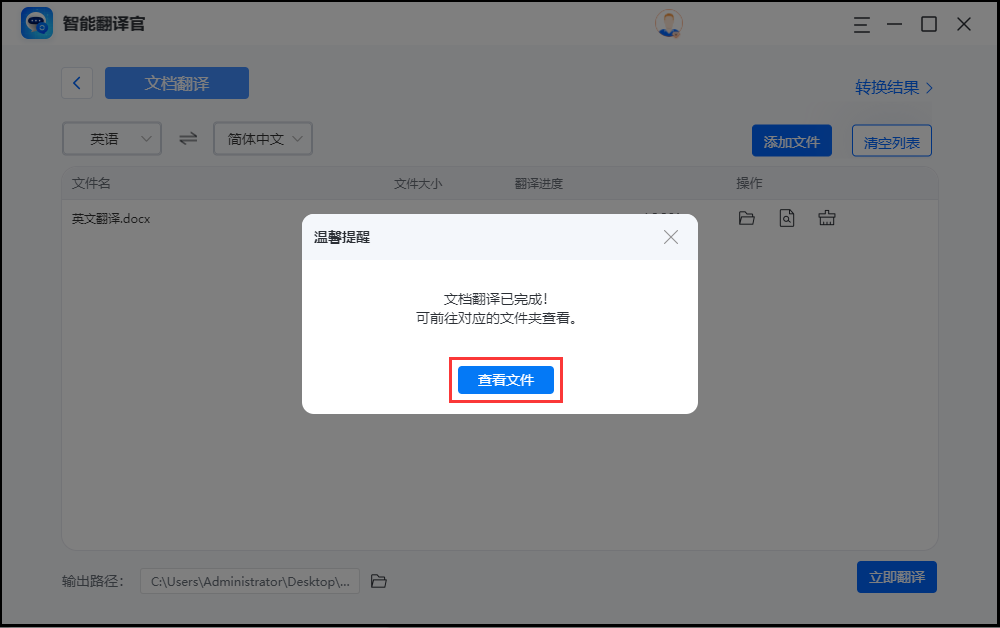 翻译完成后会出现弹窗,可前往对应的文件夹查看文档文件。