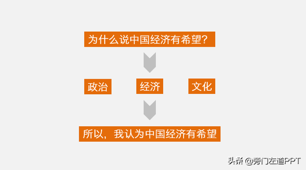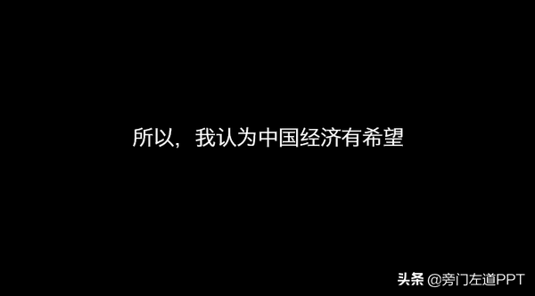 给大家举个例子,比如我们要论证中国经济有希望这一结论,我们可能会这样来写 PPT: