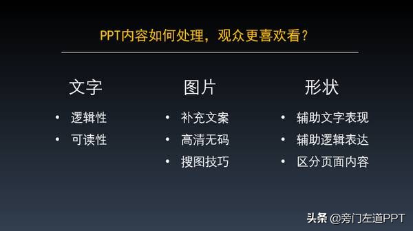 有些时候,我们是为了解决某一个问题而做 PPT 演示,也可能是为了辩论时的观点陈述,这一类的幻灯片结构一般是提出问题,罗列观点,得出结论,说的简单点,其实就是分总结构。