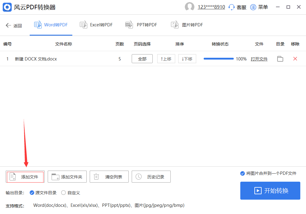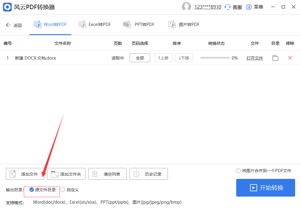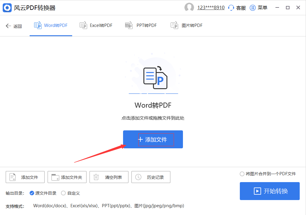 2、首先选择你的文件类型,这款软件支持word、excel、ppt、图片,你可以将这些文件格式转换为PDF。点击“添加文件”或者直接将文件拖到此处,接下来就能转换。