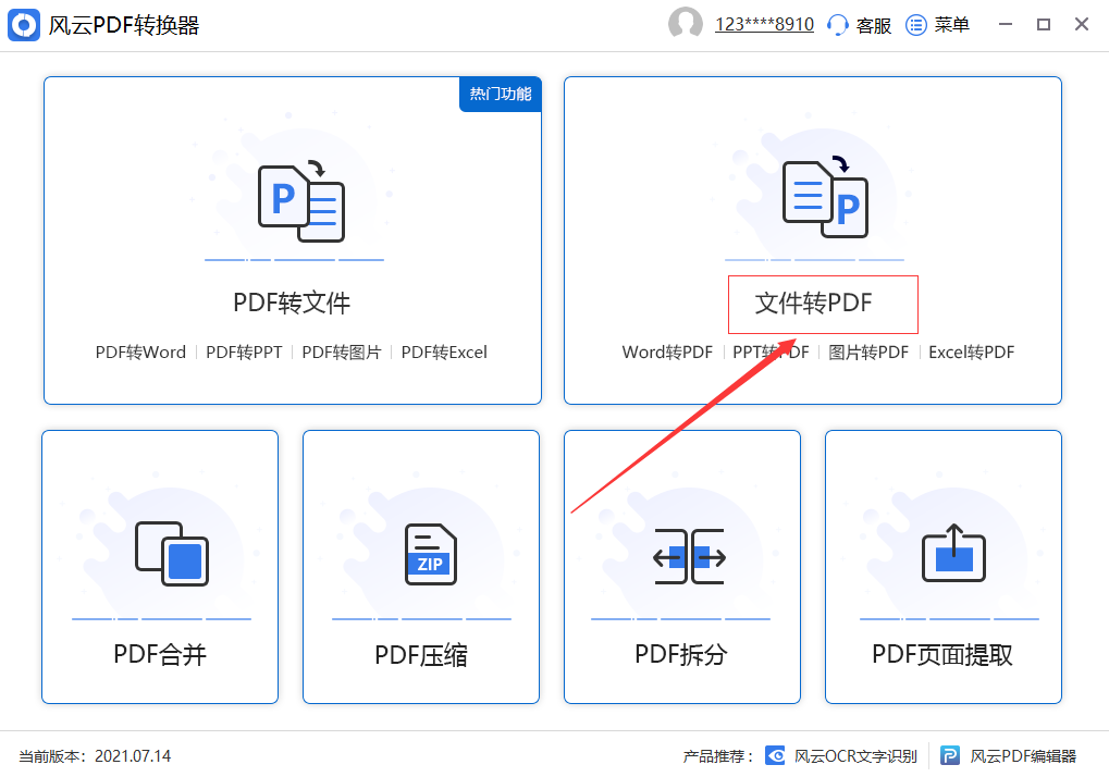 1、首先大家需要先下载并安装风云PDF转换器,然后打开软件进入功能页面。接下来点击文件转PDF功能,会自动跳转到操作栏。