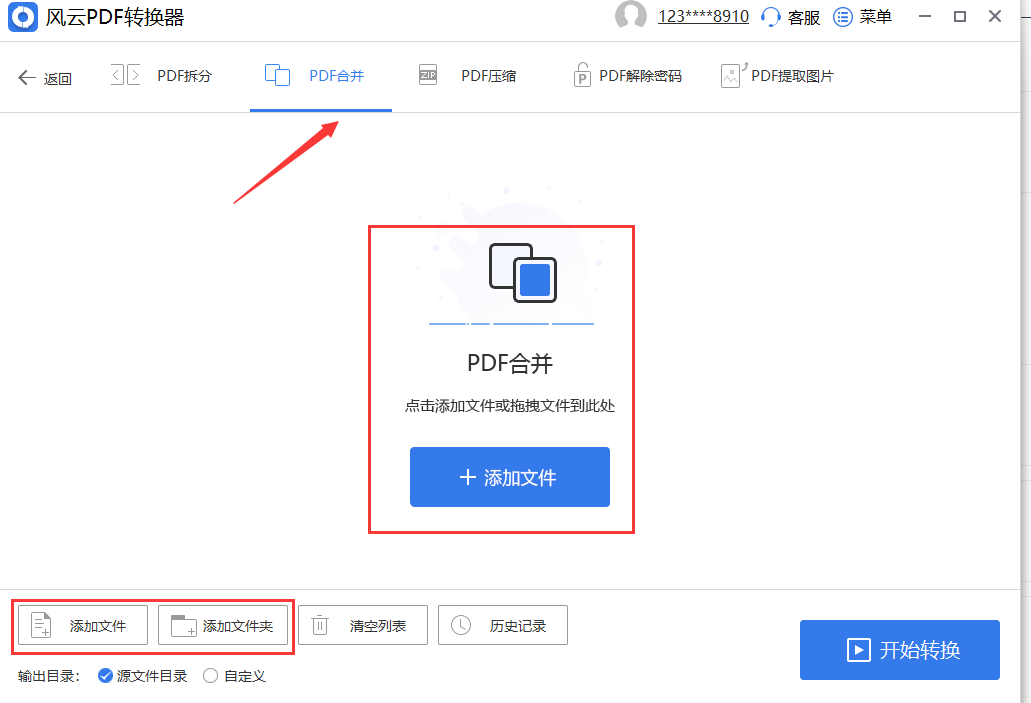 1、用户们首先需要将风云PDF转换器打开,然后在顶部的功能栏中选择【PDF合并】功能,然后可以根据需求选择两种不同的文件上传方法,所有的文件上传都是很方便的,无论是多个文件还是单个文件,各种情况都可以一键快速添加,操作步骤也很简单。