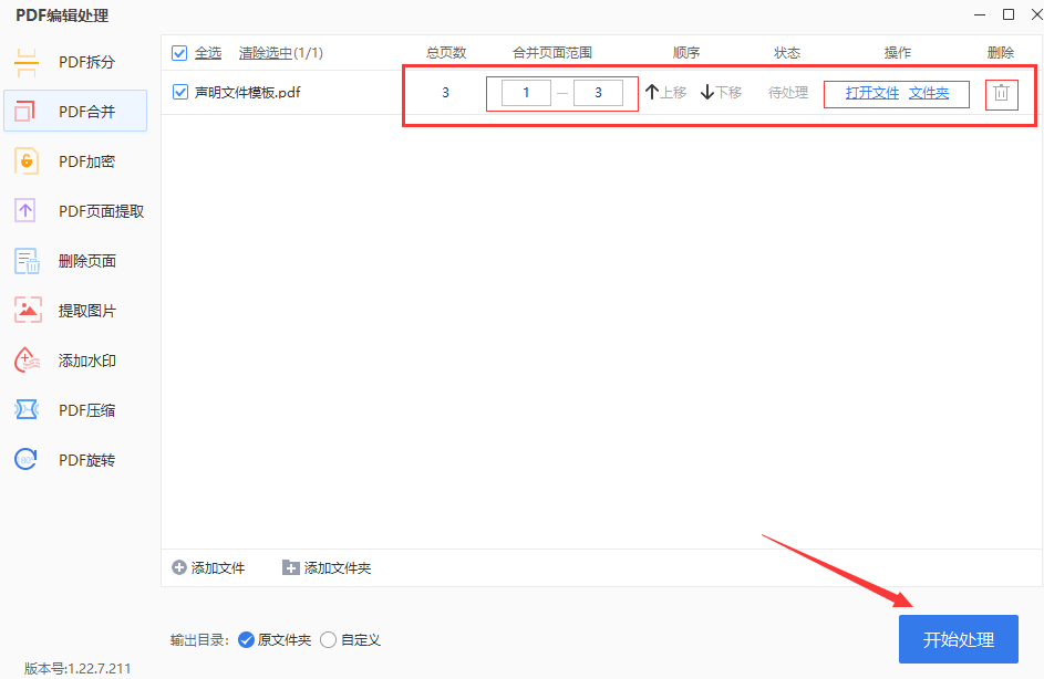 2、文件在上传文件后可以选择修改不同的页面范围,可以将所有的PPT合并为一个PDF文件,也比较方便,设置完成后点击【开始处理】,转换后的文件管理也很方便。还能够在功能栏右侧中选择删除功能,使用起来很便捷。