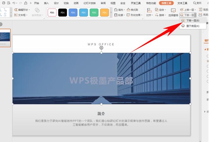 单击工具栏【绘图工具】下的【下移一层】,如下图所示: