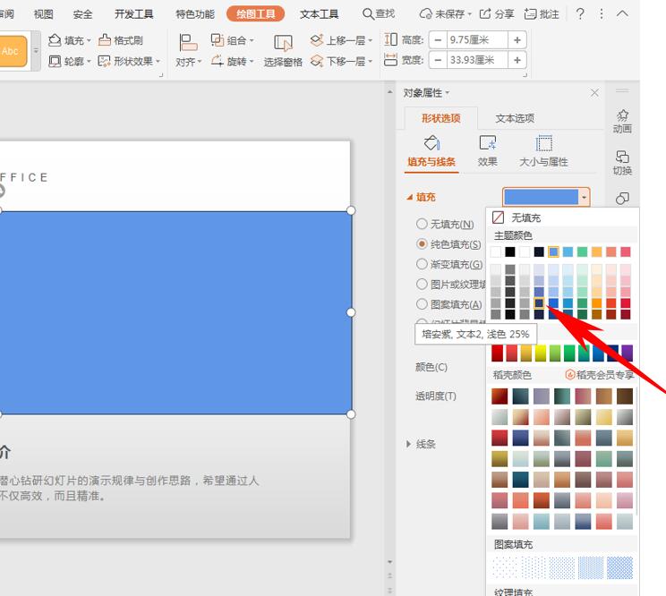 双击矩形图形,打开【对象属性】的对话框,选择【形状选项】下的【填充与线条】,在填充颜色处选择一个蒙版颜色,在这里选择培安紫,如下图所示:
