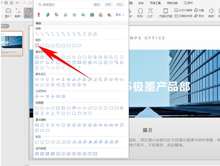 首先,单击工具栏【开始】下的【形状】,在下拉菜单下选择长方形,如下图所示: