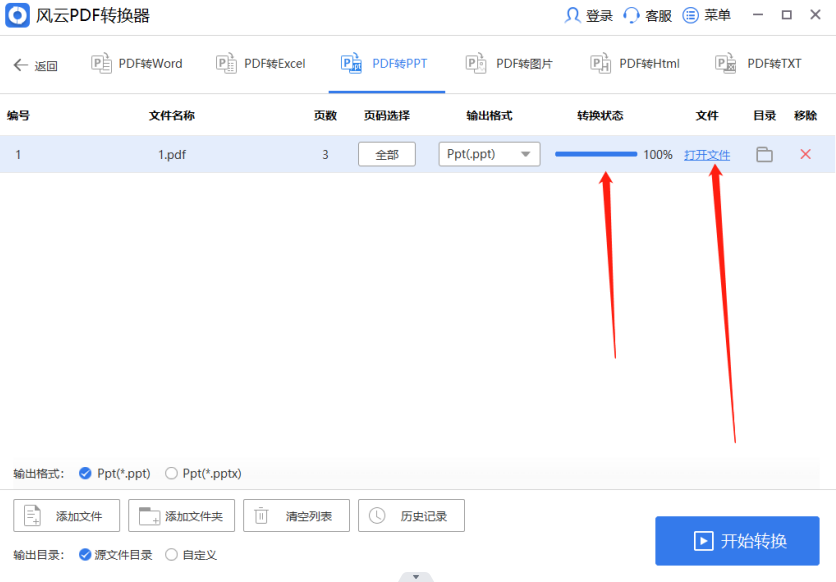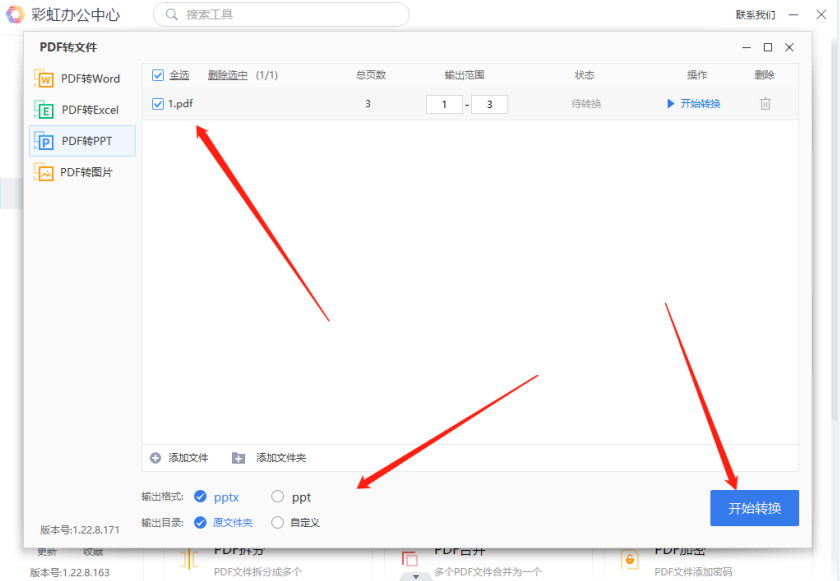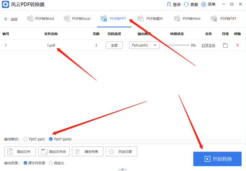 第2步,现在我们在界面当中选中这个pdf转ppt的选项,点进去之后把我们的pdf文档给放进来。然后大家自选一下输出格式,选好之后点击转换按键。