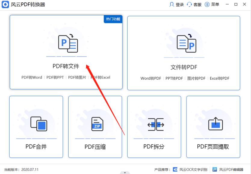 第1步,安装好我们的风云PDF转换器,打开后在界面当中锁定这个【pdf转文件】的选项进入。