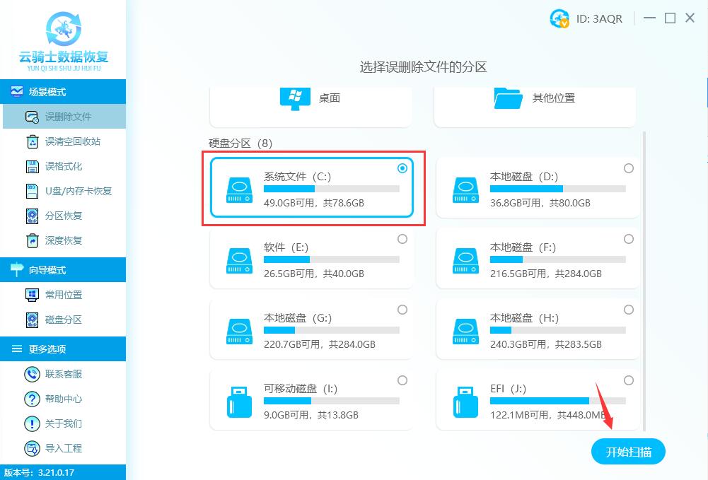 1.打开云骑士数据恢复,在【场景模式】下选择【误删除文件】。