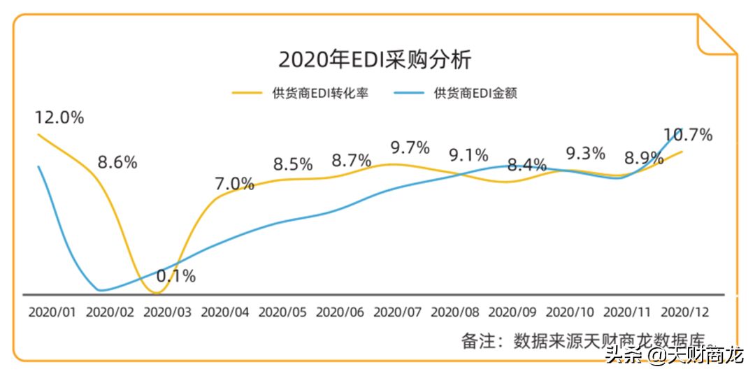 从2020年EDI采购趋势来看,餐饮行业经过受疫情冲击的严冬期后,供应商线上EDI转化率趋势波动比较平稳,可以看出整体有9%左右的供货商选择了在线接单,供货商线上化程度比较低,同时也表明未来的云端采购发展潜力巨大。