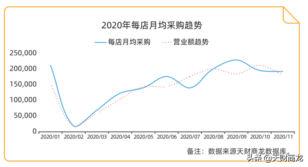 从2020年店均采购金额趋势发现,餐饮行业经过受疫情冲击的严冬期后,店均采购金额趋势与餐饮行业的营业收入趋势大致相同,整体波动上升,由下图可知,每月的店均采购金额在15万~23万之间浮动,如果按照50%毛利率进行大致反推,则店月毛利润在25万元以内的门店居多。