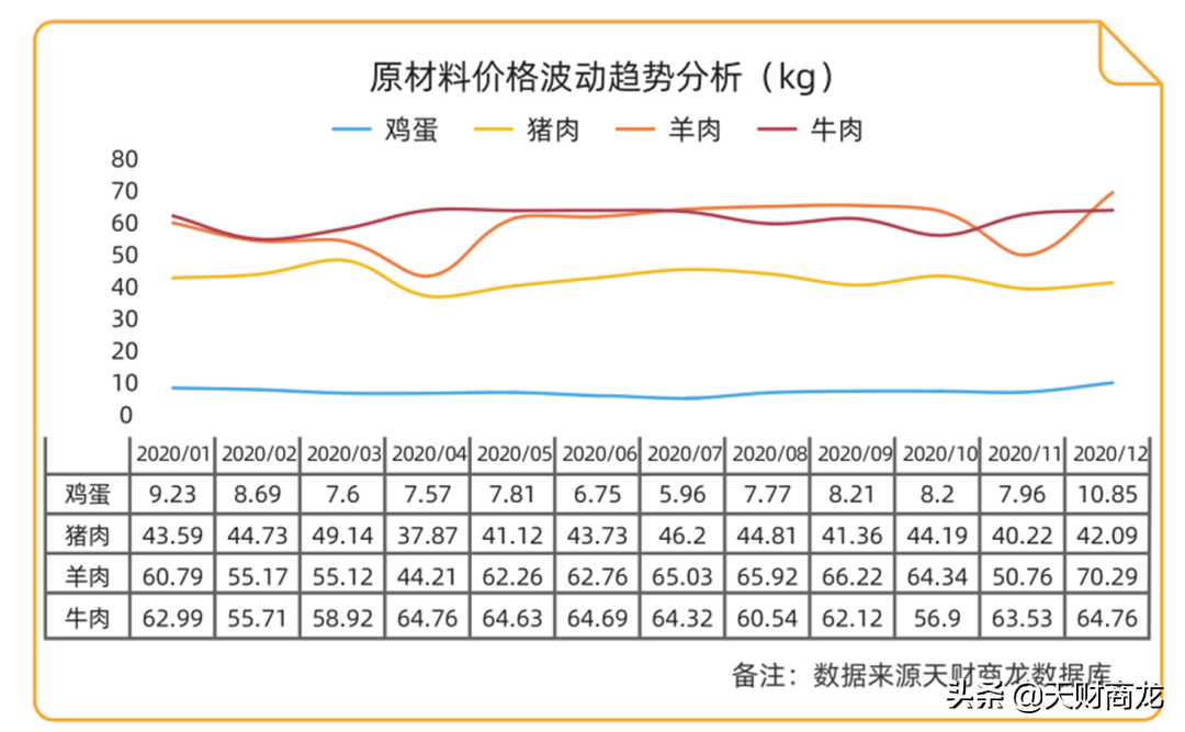 原材料采购是餐饮成本控制的最重要的一环,评估市场的原材料价格,并在合适的时机储备及采购,成为餐饮成本控制重要手段;研究主要原材料价格波动对比发现,在2020年,鸡蛋价格在8.0元/kg左右浮动,进入12月份后,受节假日及疫情影响,价格上升明显,达到10.85元/kg;羊肉价格波动比较大,商家需要看准采购时机入手;猪肉价格在进入4月份后,政府调控加大,中央储备肉投放市场,猪肉价格有所下降,维持在43元/kg左右。