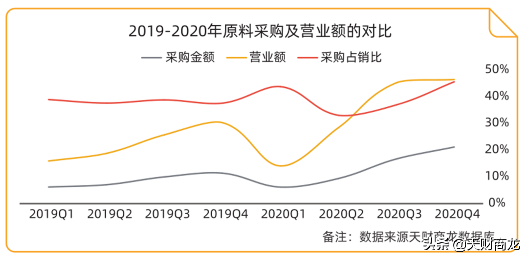 从2019年~2020年季度采购趋势发现,原材料采购金额与营业额趋势基本成正比波动,在2020年Q1季度,受疫情影响,餐饮门店基本停销,原材料有积压,估采购占销比偏大。