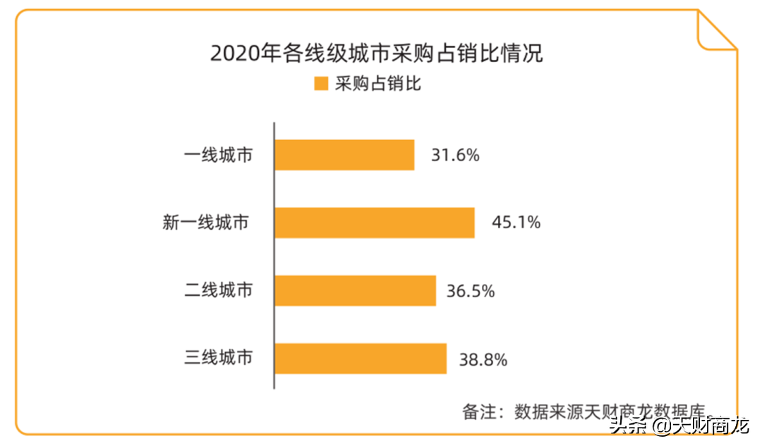 从2020年城市线级采购占销比数据中发现,一线城市的采购占销比最低,为31.6%,新一线城市最高,达45.1%,二线城市、三线城市分别为36.5%,38.8%。