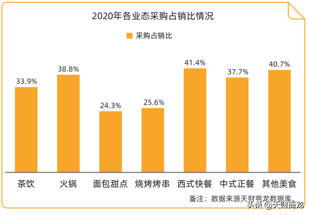 从2020年各业态采购占销比数据中发现,面包甜点和烧烤烤串的采购占销比最低,分别为24.3%、25.6%;西式快餐、火锅、中式正餐的采购占销比较高,分别为41.4%、38.8%、37.7%。
