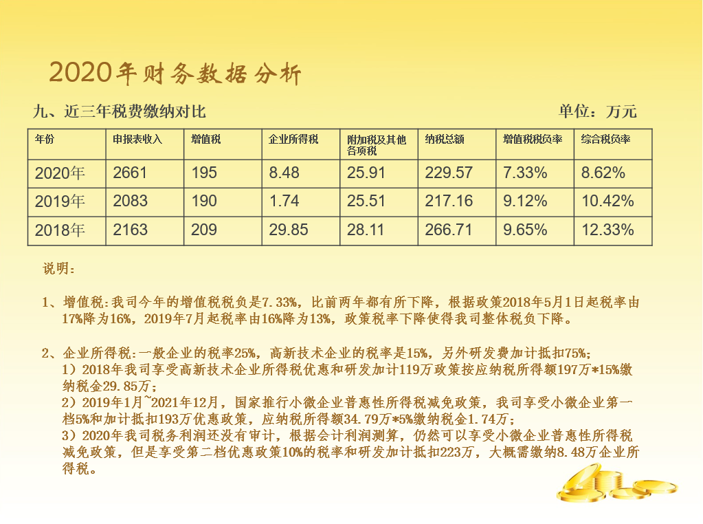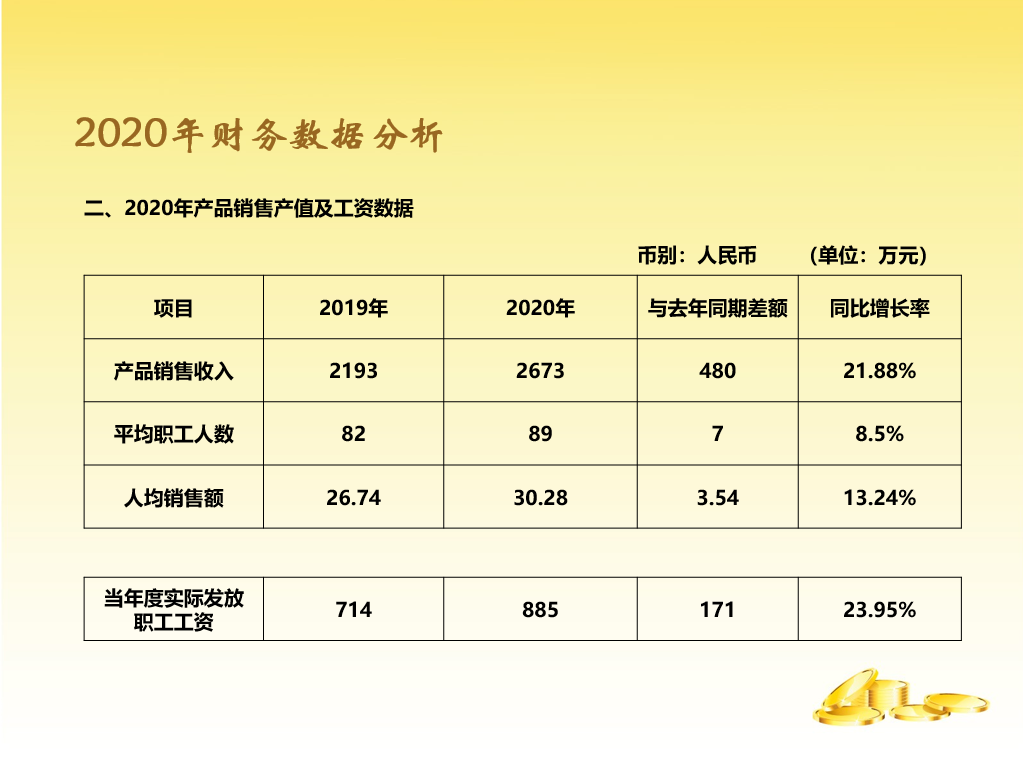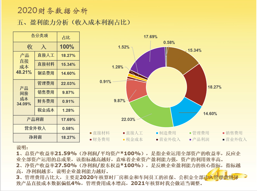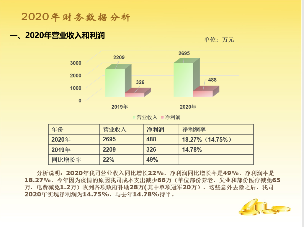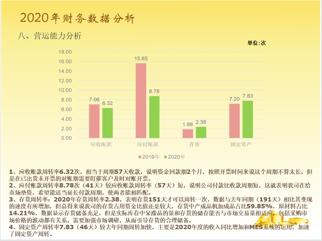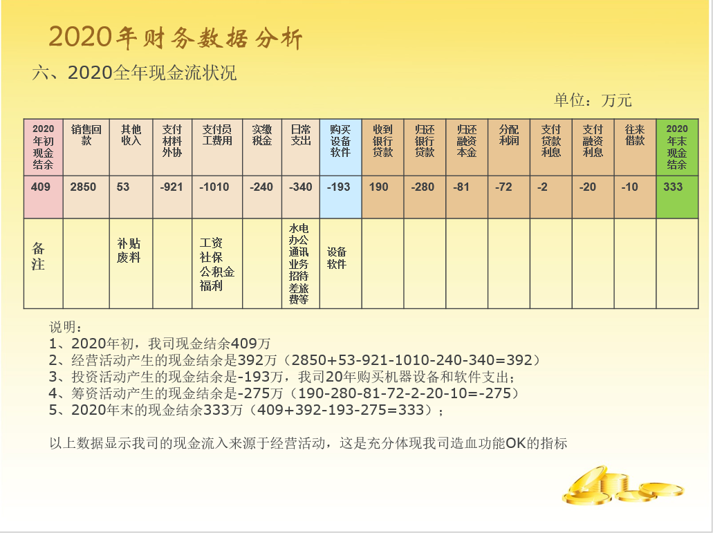 很多学员都说,财务部的年终总结报告不知道做些啥内容,看着公司其他部门:行政、销售、采购、生产、技术等等他们的报告内容都丰富多彩,水平很高,轮到我们财务好像很LOW,我们财务说啥好呢?相关内容都已经被各部门瓜分了呀!另外还要考虑:报告上哪些内容可以说,哪些内容不能说,各个管理层能不能都能看懂?他们到底关心什么?财务都是数据,可是报告不能都是数据,看起来枯燥无味,让人看得打嗑睡,也不能太复杂,全部看得一脸懵。要既能突显财务水平,还能让人通过报告简单学习一把财务知识,这样的报告才有意义。在头条上也能看到好多专业的大神,做的各种动态分析表,非常吸引人眼球,本人水平有限,做了一份通俗易懂版的送给大家,希望同行多多指正,请大家关注模板,不要太关注数据。(备注一下:本人喜欢黄色,因为黄色代表金钱[大笑])
