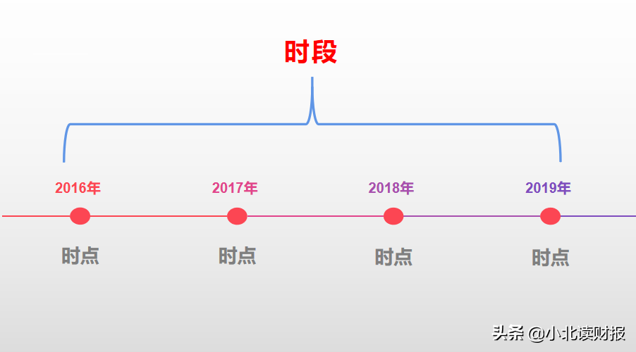 如下图所示,一个时点到另一个时点之间的距离,就是一个时段。时点是一个瞬间,时段是一段时间。