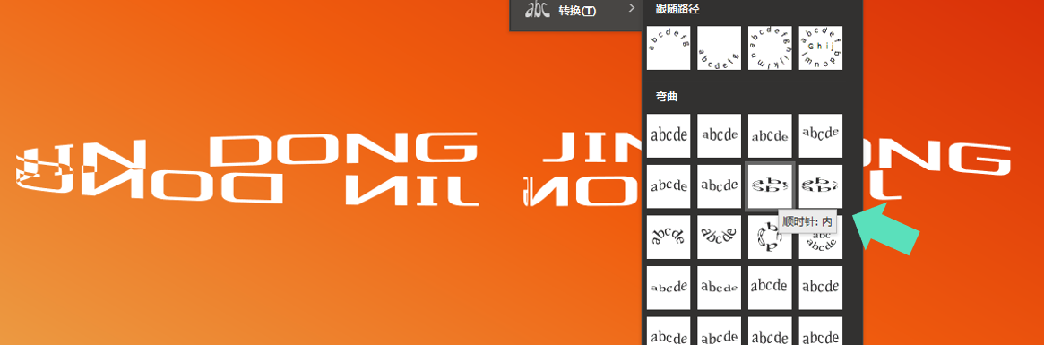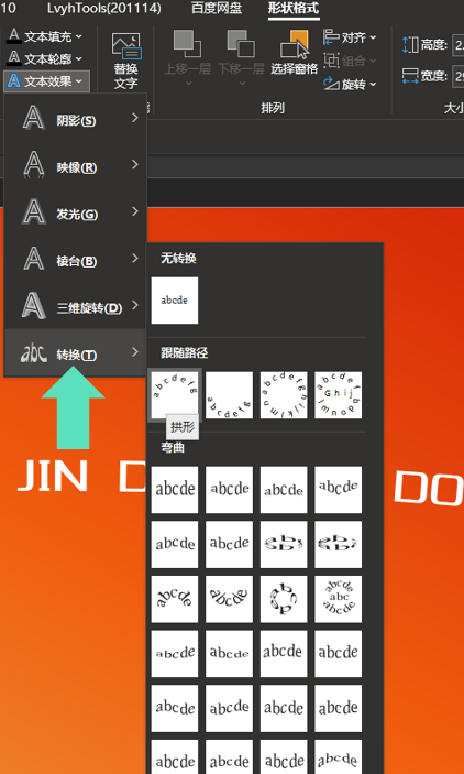 2、还是找到我前面提到的“文本效果”,找到"转换"这一栏,里面有超多的预设效果: