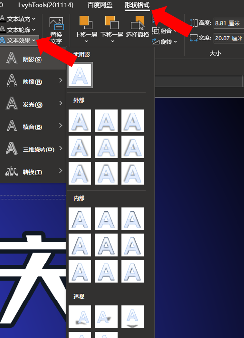 选择文本,点击右键,你会在界面中找到形状格式这一个功能,然后你只需要找到“文本效果”就ok: