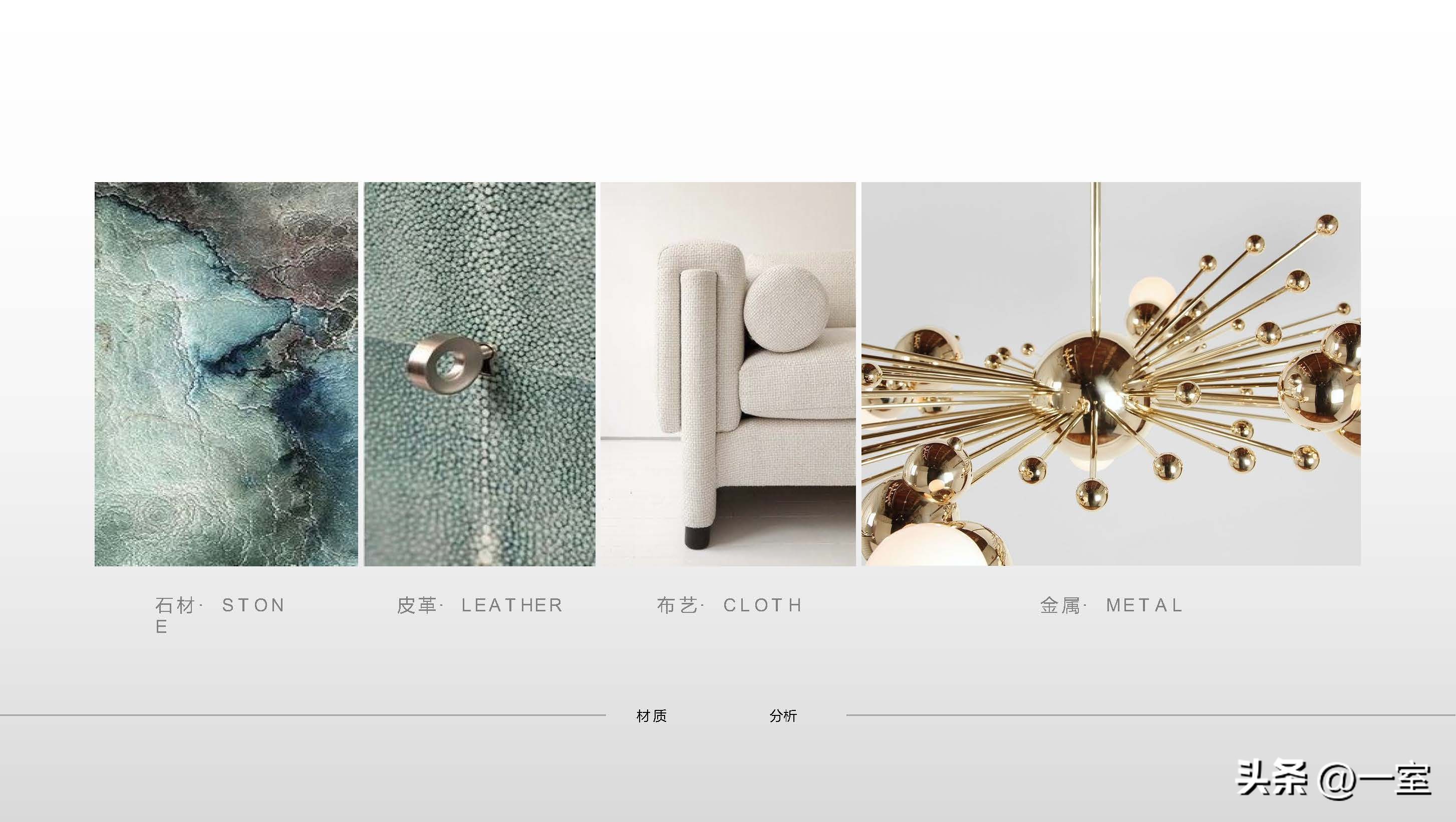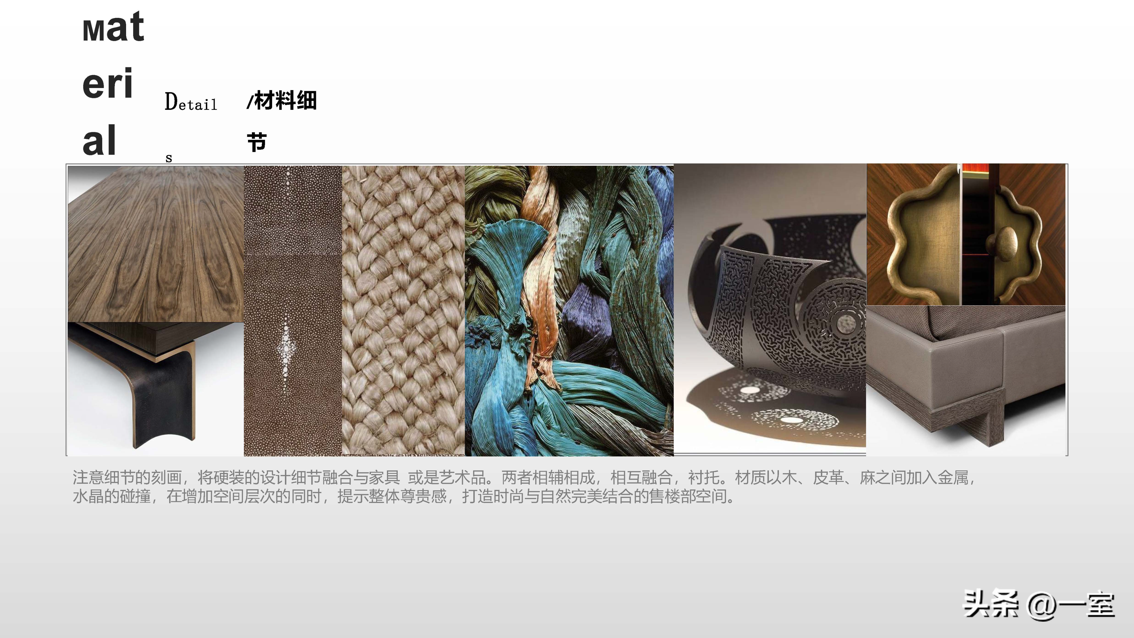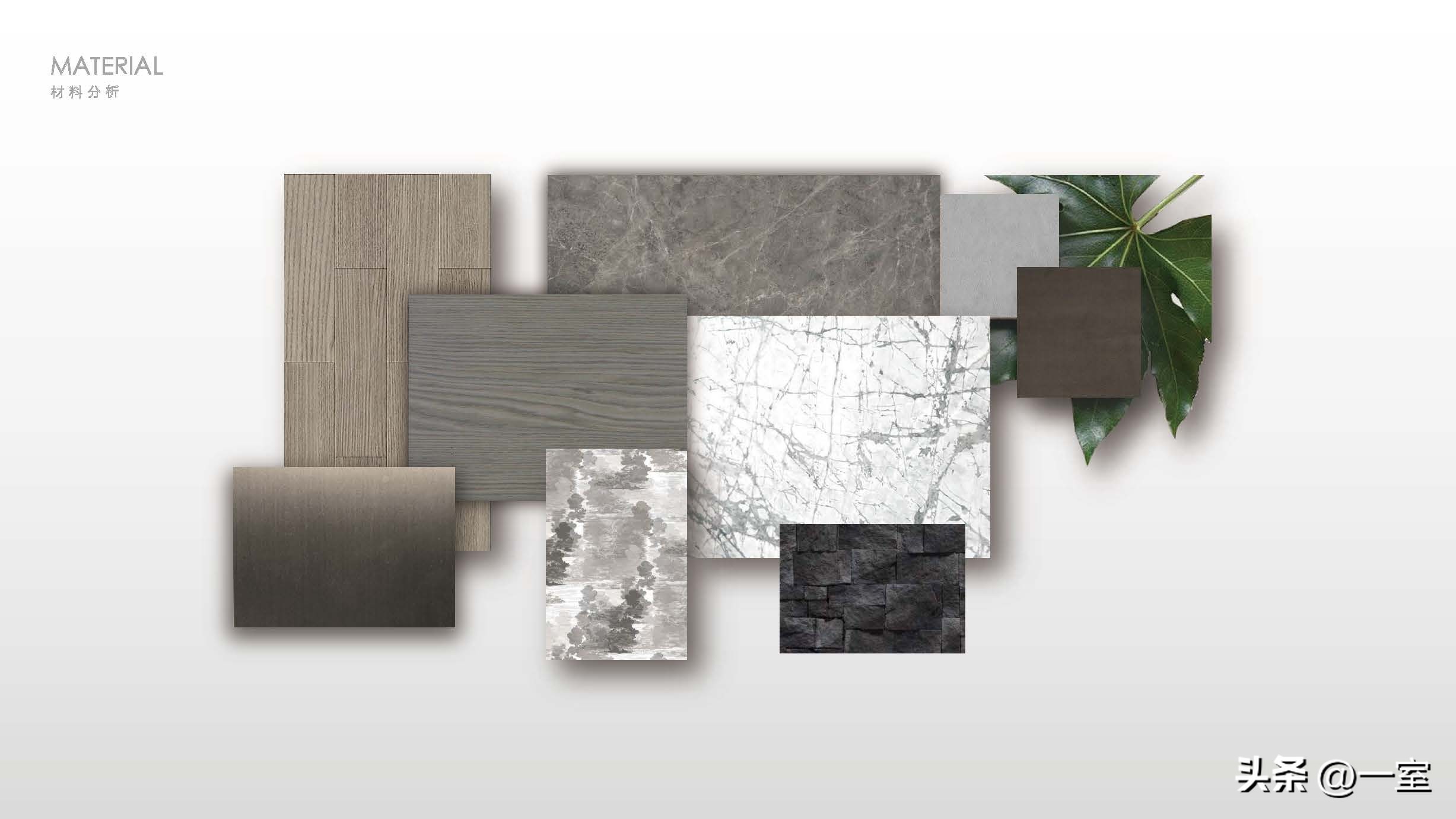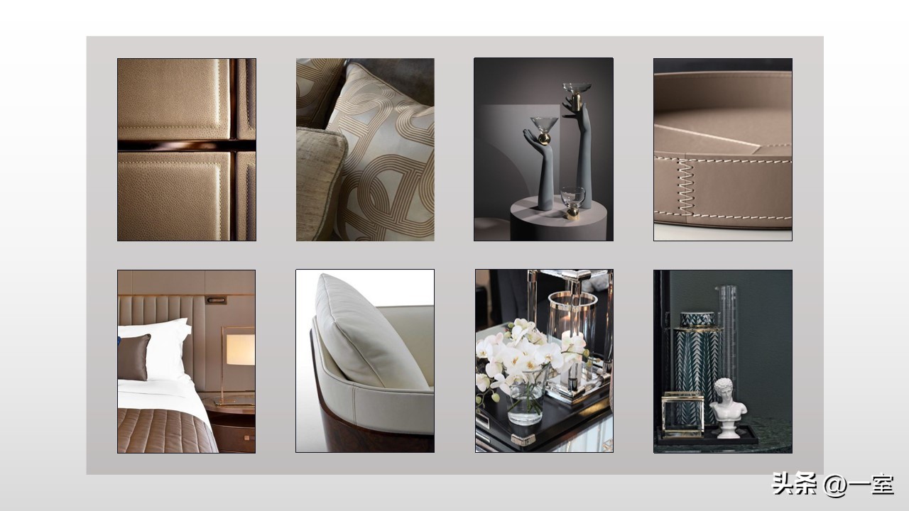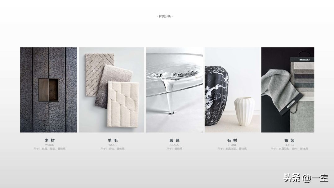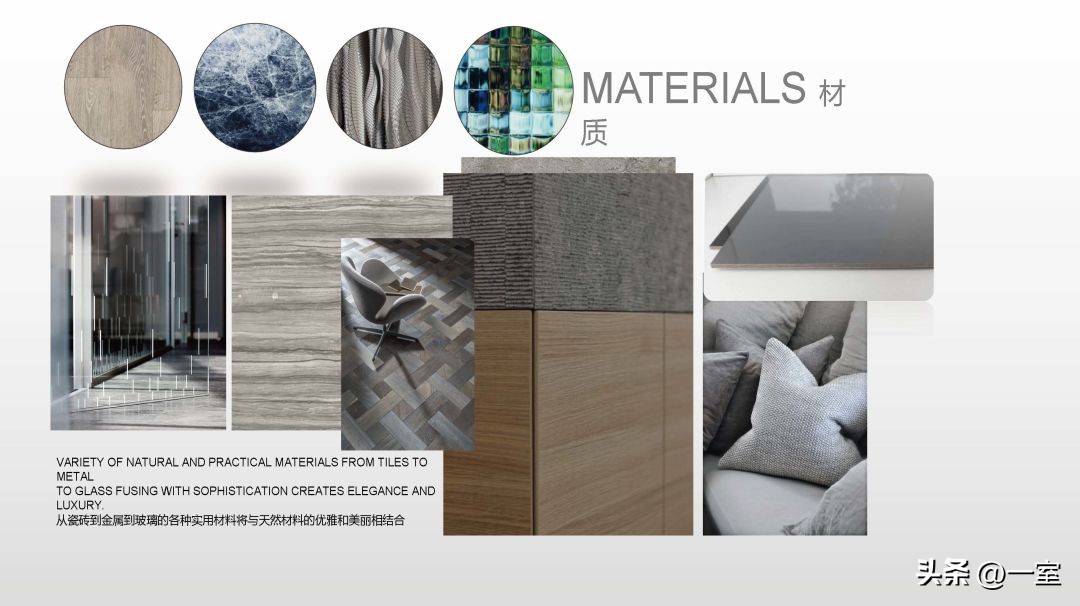 材料的选择与使用在装修中是很重要的一部分,在PPT中当然也要体现出来。将硬装与软装中的主要材料搭配展现出来,不同的材质搭配效果不同。