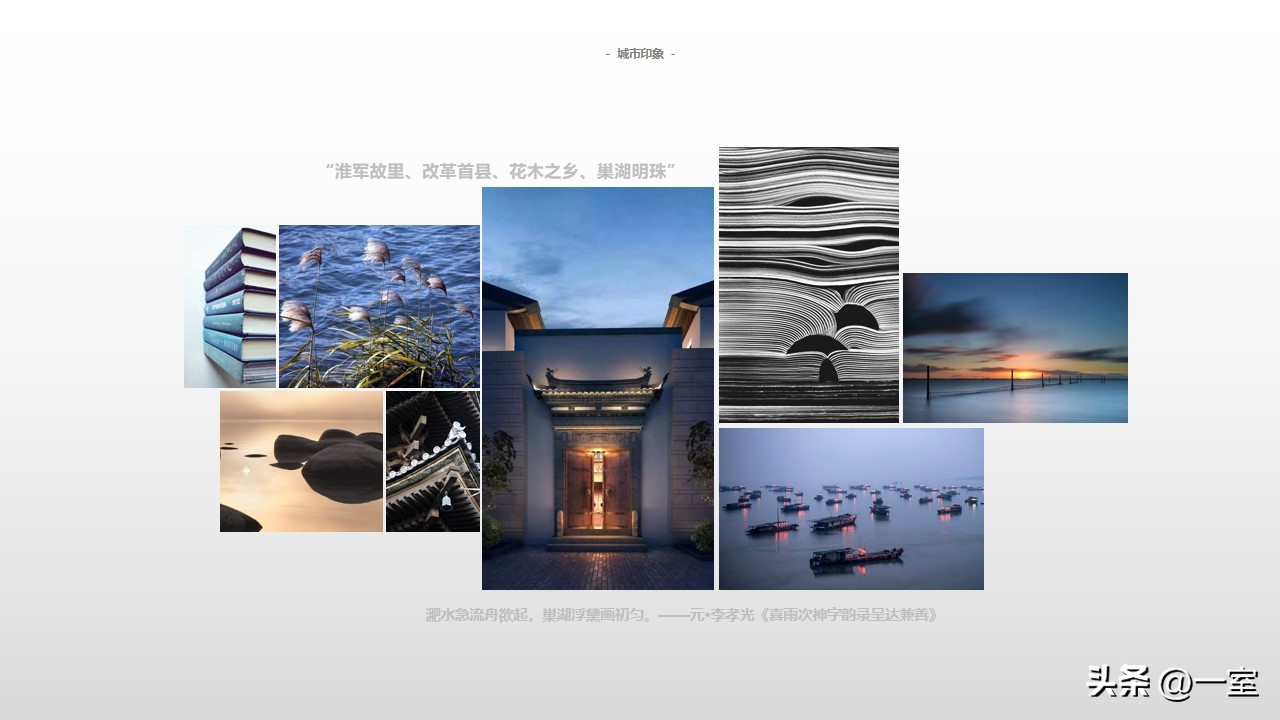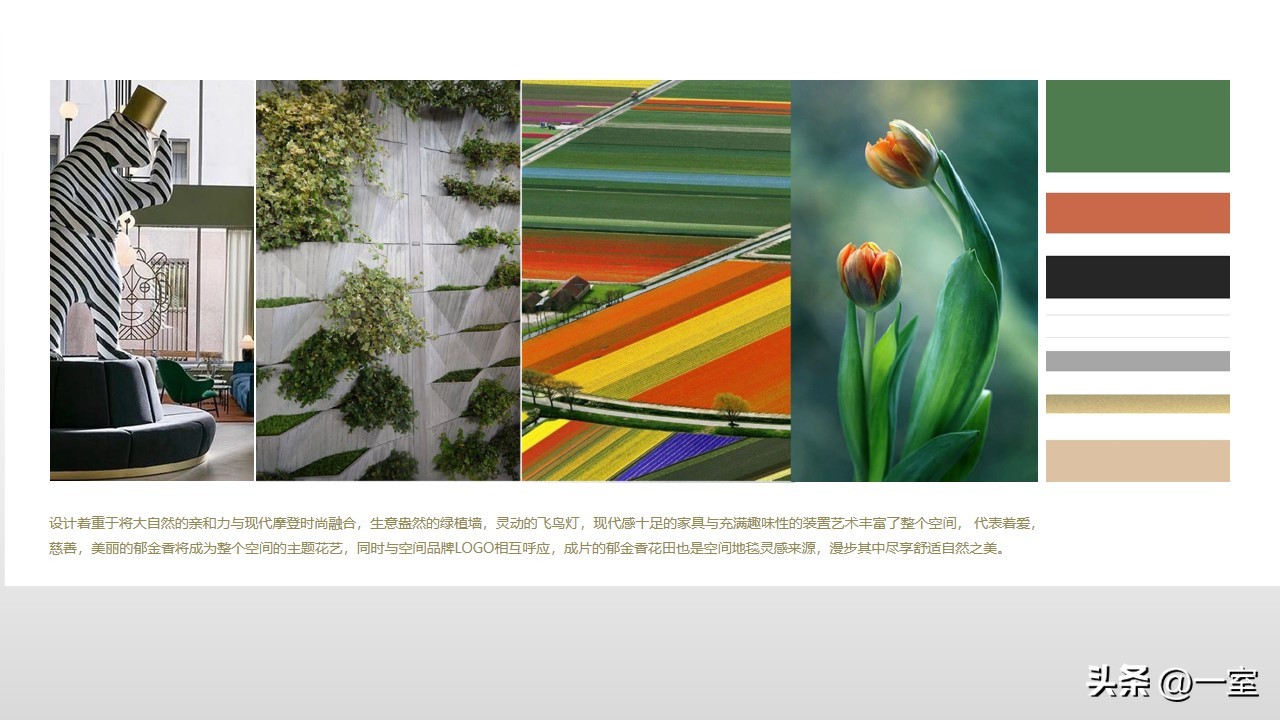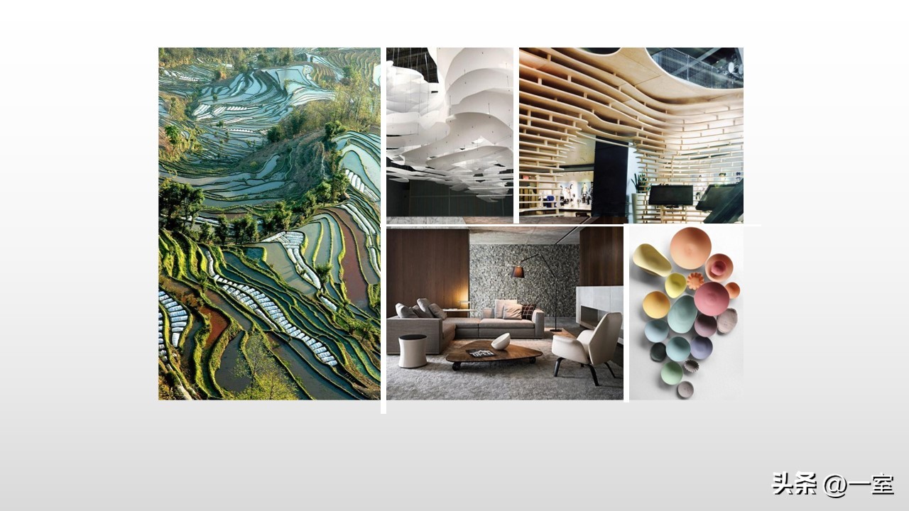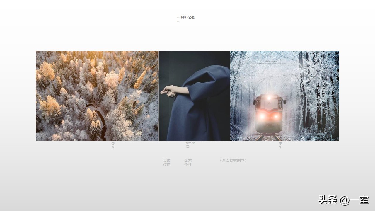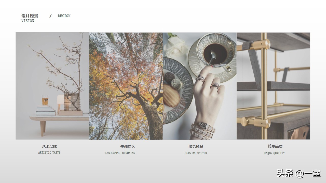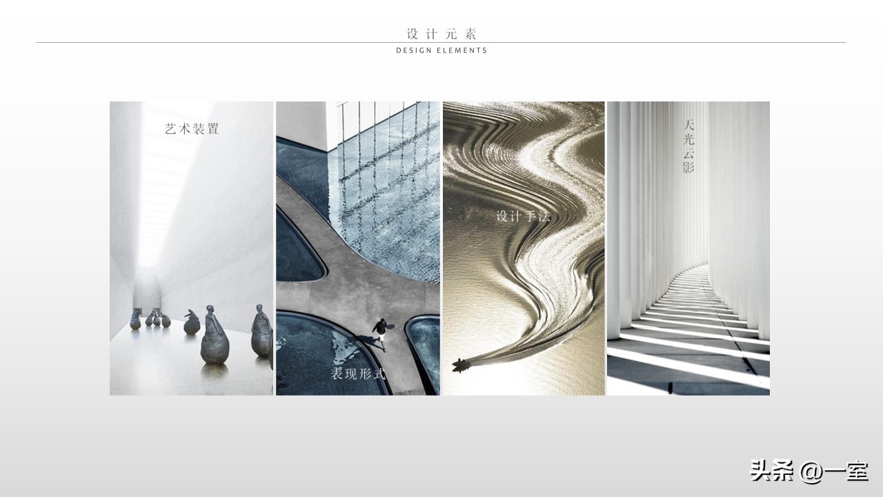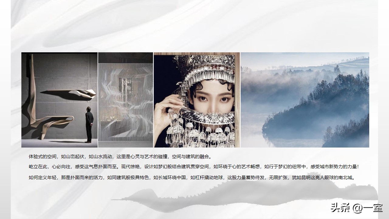 一般在PPT的开头,会有概念氛围图,从这里开始,内容就已经与设计方案挂钩了。这个概念氛围图可以是自然、建筑元素,也可以是地域、艺术元素等等。