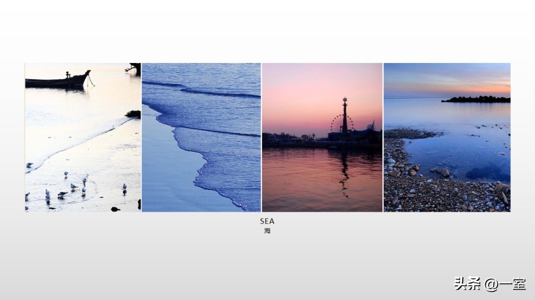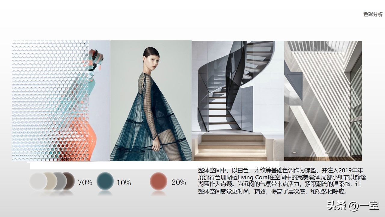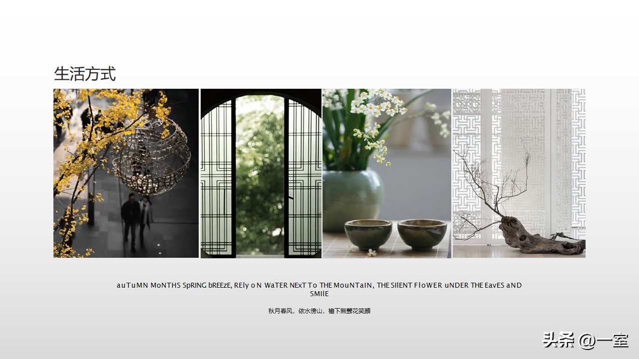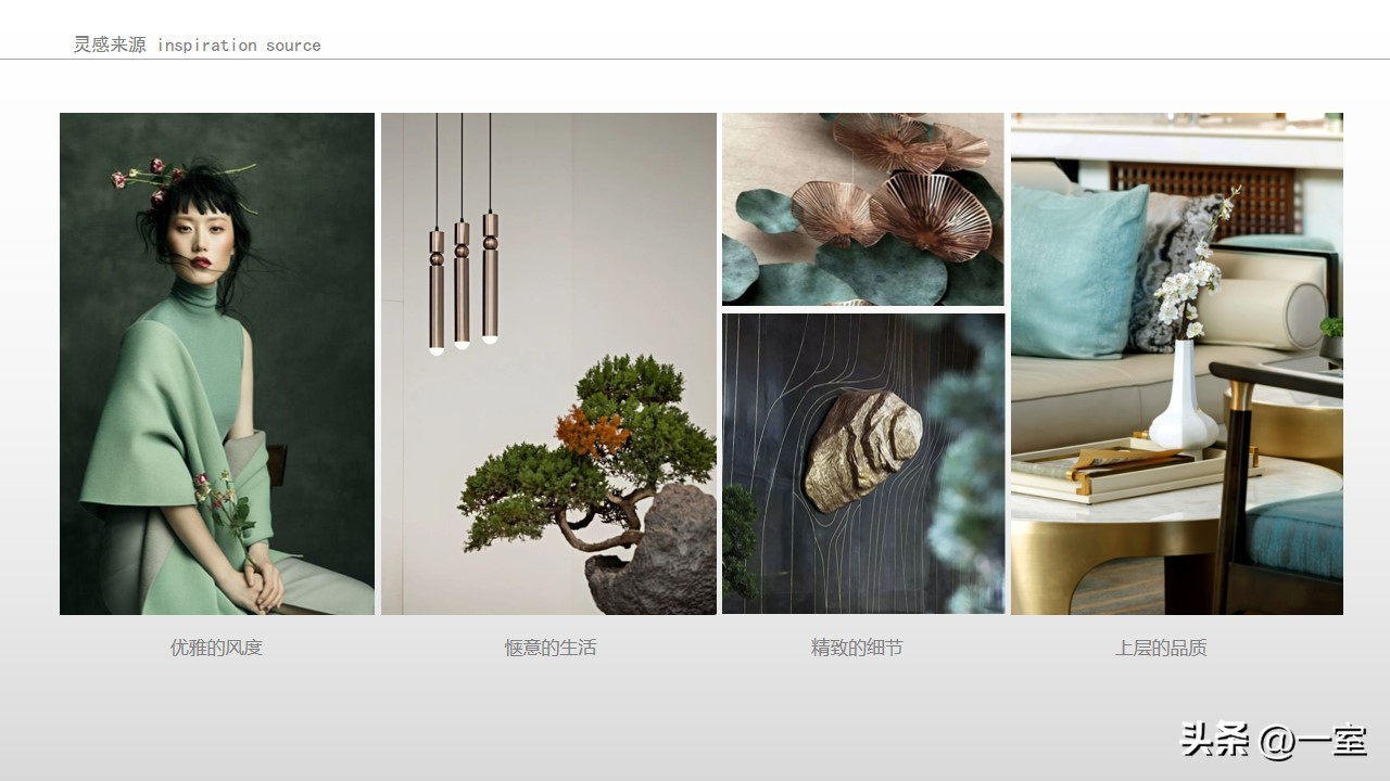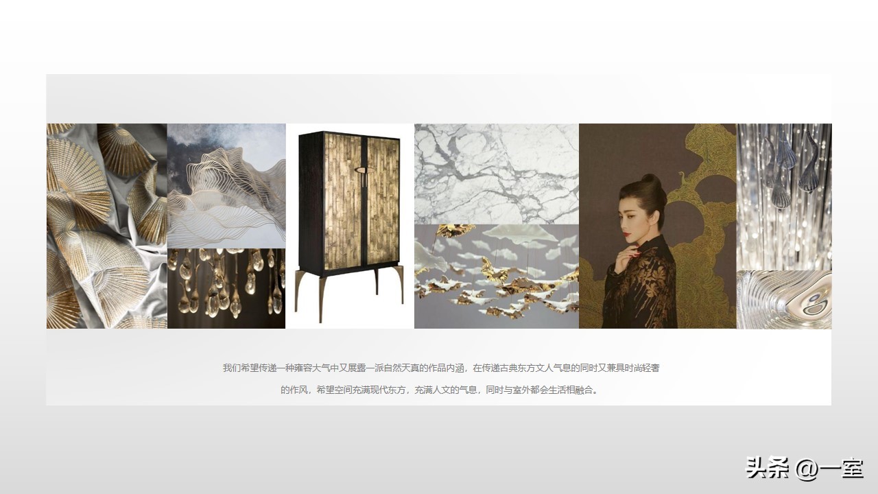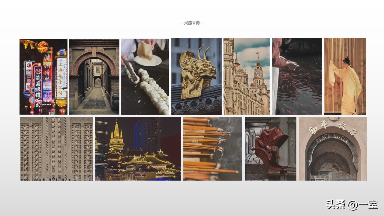 一般在PPT的开头,会有概念氛围图,从这里开始,内容就已经与设计方案挂钩了。这个概念氛围图可以是自然、建筑元素,也可以是地域、艺术元素等等。